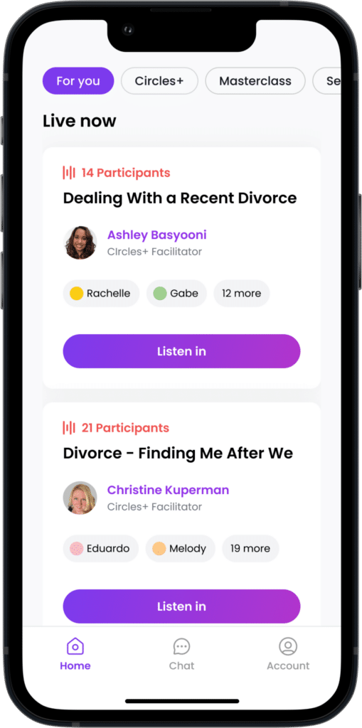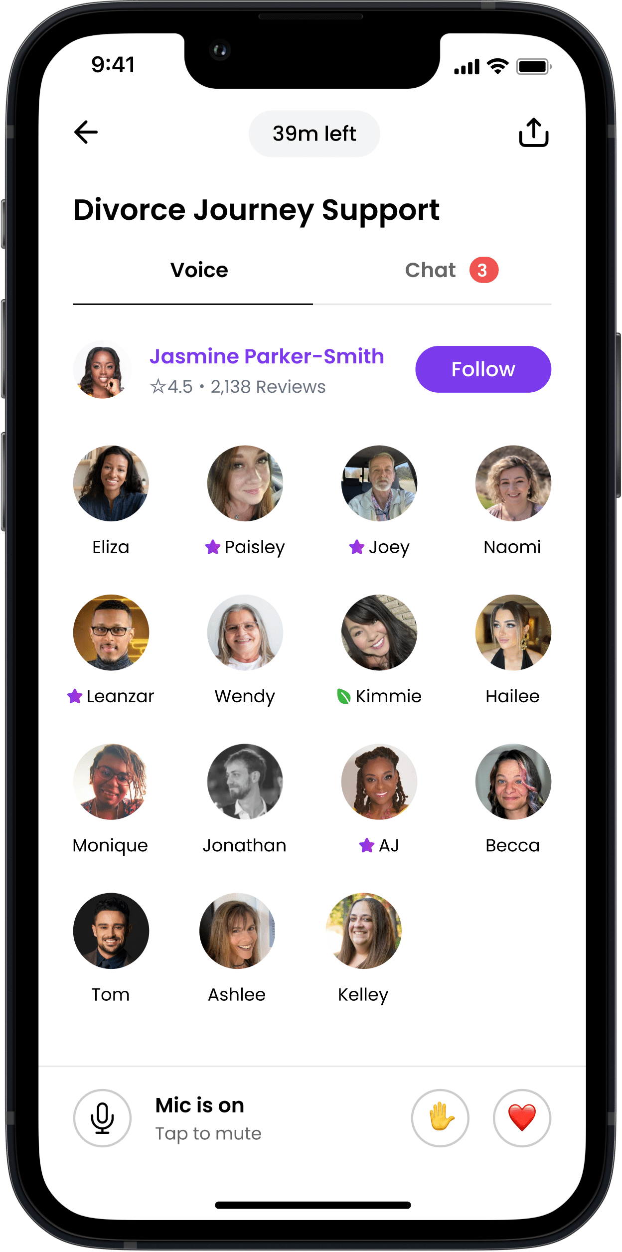 Join live audio rooms and share thoughts, ask questions, or learn from others on a similar journey.